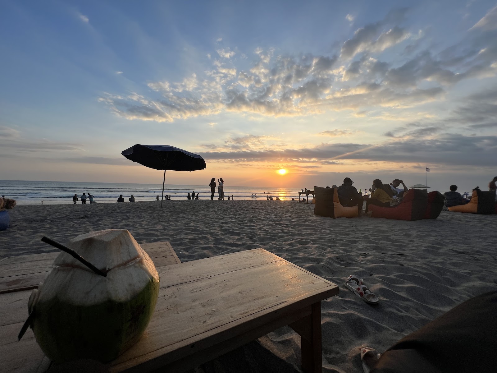 Double Six Beach, sitting between Seminyak and Legian, is where Bali’s sunset culture thrives. As the day winds down, colorful beanbags and umbrellas line the sand, creating a laid-back festival vibe. Travelers sip cocktails, snack on grilled corn, and watch the horizon melt into fiery hues.